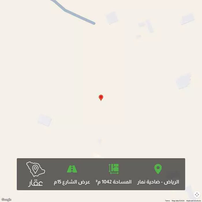 1042 م² أرض في ضاحية نمار، الرياض معروضة بسعر ٢٬٧٠٠٬٤٨٩ ريال، أعلى بنسبة 260% من متوسط سعر الحي البالغ ٧٥٠٬٠٠٠ ريال. بناءً على 439 عقار مشابه.