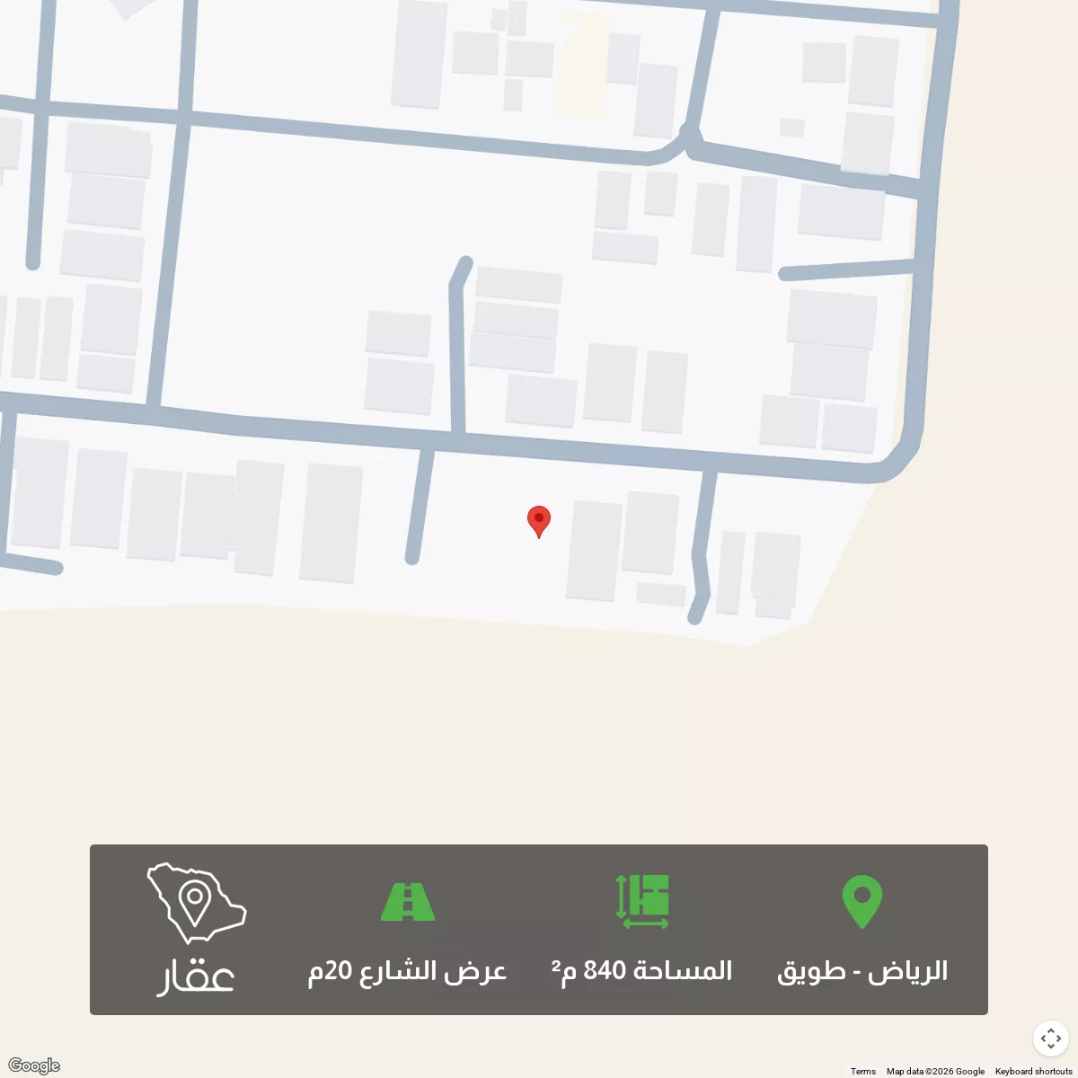 عرض على Aqarللبيع أرض سكنية متظاهرة – حي طويق، الرياض المساحة: 840 م² الأطوال: 20م × 42م الموقع: شارع 20م شمالي + جنوب ممر 7م الأرض تقع مباشرة بجوار مشروع الرياض الخضراء طبيعة الارض ممتازة جداً سعر البيع: 2200 لل...