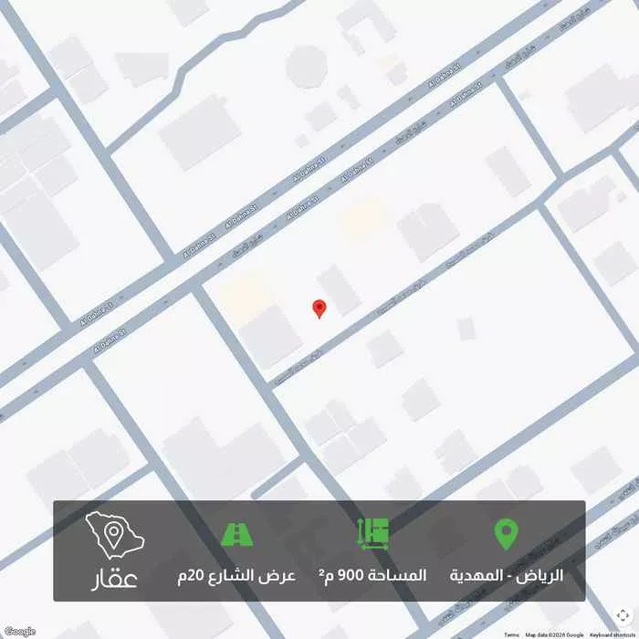 900 م² أرض في المهدية، الرياض معروضة بسعر ٤٬٥٠٠٬٠٠٠ ريال، أعلى بنسبة 147% من متوسط سعر الحي البالغ ١٬٨٢٠٬٢٠٠ ريال. بناءً على 375 عقار مشابه.