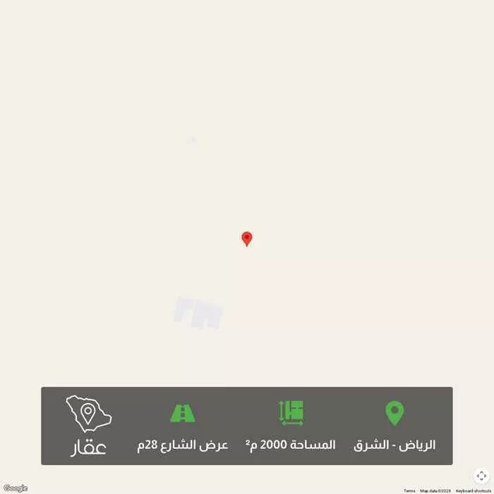 2000 م² أرض في الشرق، الرياض معروضة بسعر ٧٥٠٬٠٠٠ ريال، أعلى بنسبة 25% من متوسط سعر الحي البالغ ٥٩٨٬٩٥٠ ريال. بناءً على 650 عقار مشابه.