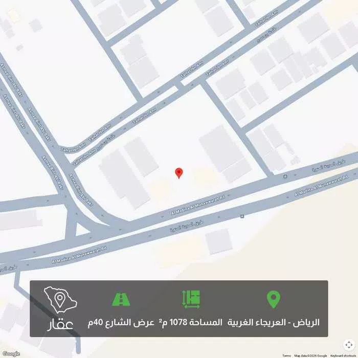 عرض على Aqarللبيع أرض تجارية مساحة ( 1078. 75) ألف وثمانية وسبعون طريق المدينة المنورة ( شارع ٤٠ جنوبي) قريبه من محطة طريق المدينة المنورة الحيوي وشريان في مدينة الرياض جنوبية أطوالها 26*41
