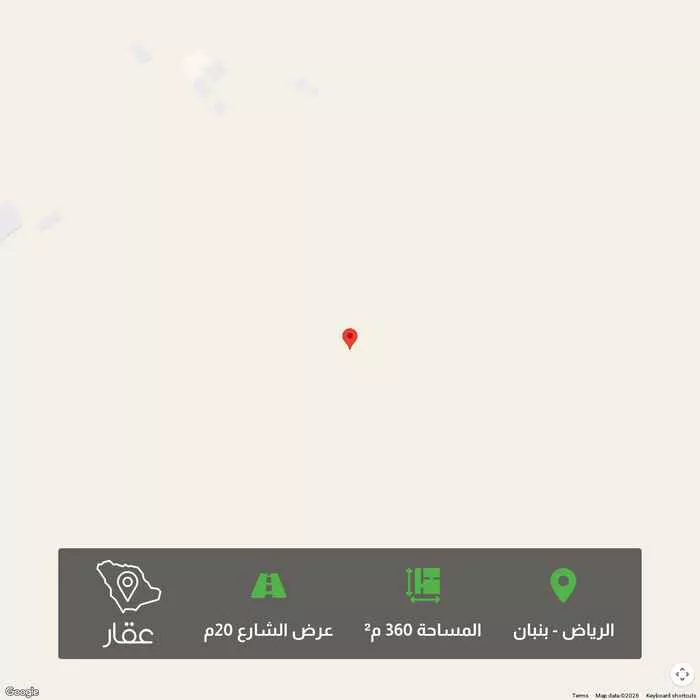 360 م² أرض في بنبان، الرياض معروضة بسعر ٧٠٢٬٠٠٠ ريال، أقل بنسبة 13% من متوسط سعر الحي البالغ ٨٠٤٬٥٦٢٫٥ ريال. بناءً على 944 عقار مشابه.