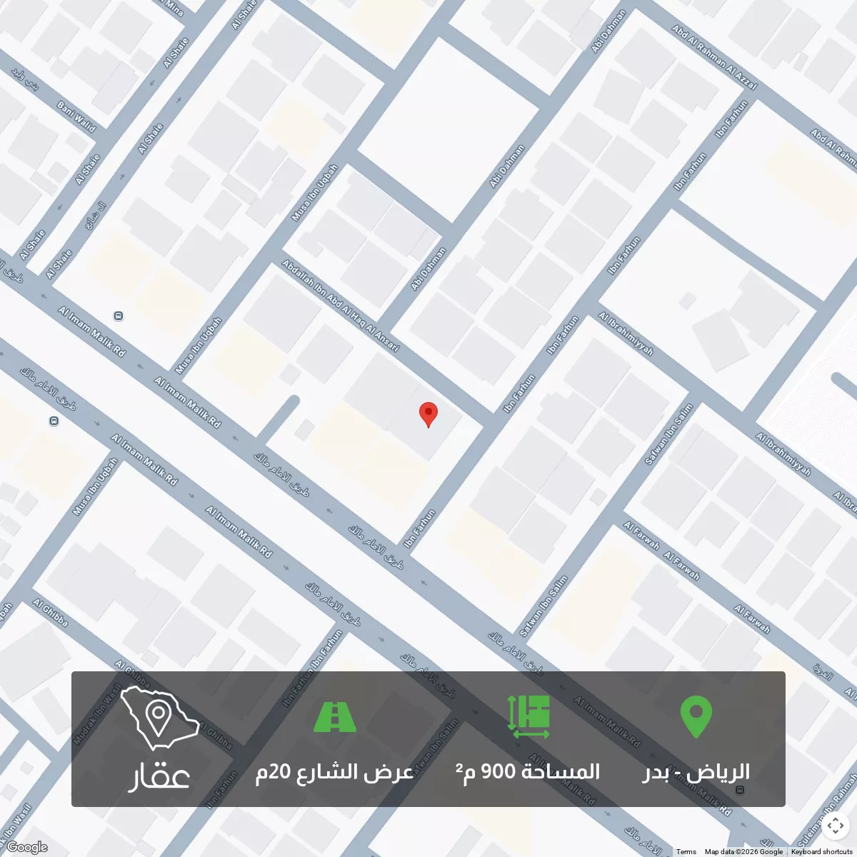 عرض على Aqarللبيــــــــع قطعه ارض سكنيه بحي بدر مقام عليها فيلا المساحه ٩٠٠م زاويه شارع ٢٠م الاطوال ٣٠ف٣٠