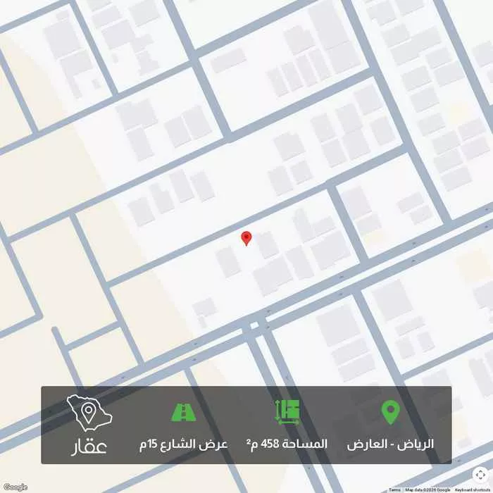 458 م² أرض في العارض، الرياض معروضة بسعر ٢٬٧٥٣٬٧٠٠ ريال، أقل بنسبة 15% من متوسط سعر الحي البالغ ٣٬٢٤٥٬٨٢٤ ريال. بناءً على 361 عقار مشابه.