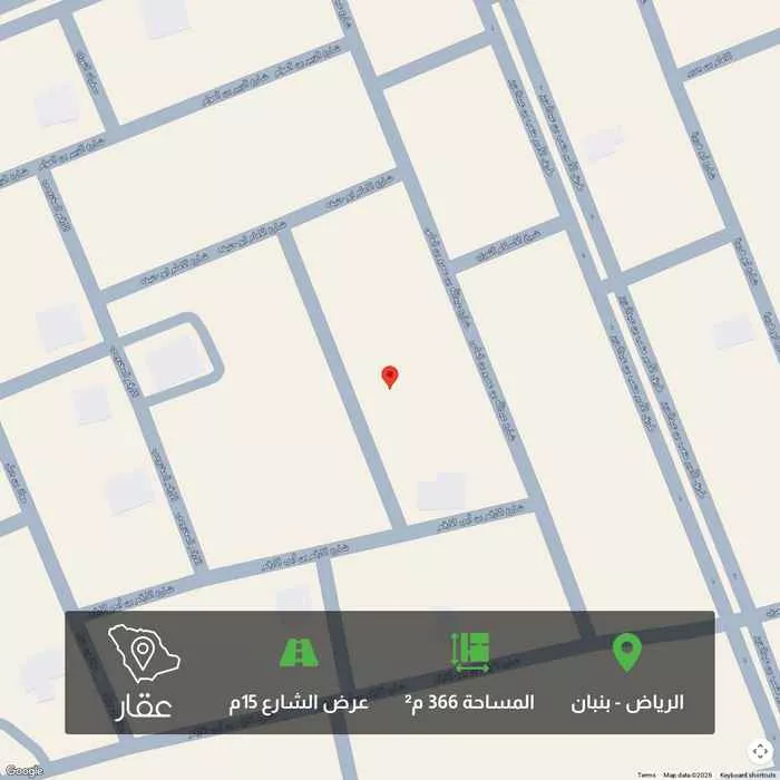 366 م² أرض في بنبان، الرياض معروضة بسعر ٥٤٩٬٩٠٠ ريال، أقل بنسبة 32% من متوسط سعر الحي البالغ ٨٠٤٬٥٦٢٫٥ ريال. بناءً على 944 عقار مشابه.