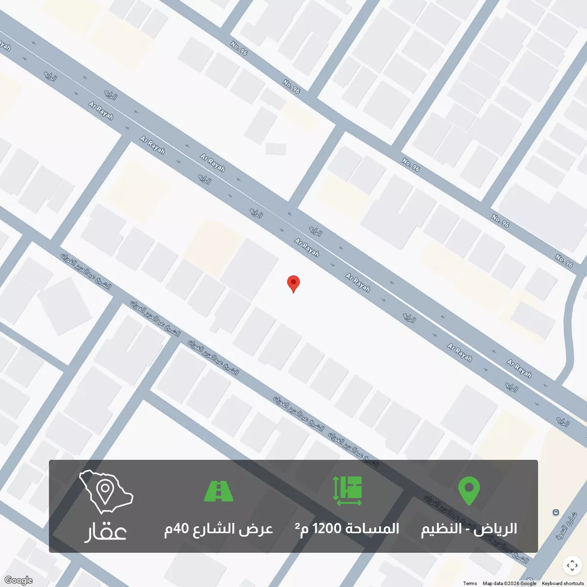 1200 م² أرض في النظيم، الرياض معروضة بسعر ٣٬٦٠٠٬٠٠٠ ريال، أعلى بنسبة 378% من متوسط سعر الحي البالغ ٧٥٣٬٠٠٠ ريال. بناءً على 228 عقار مشابه.