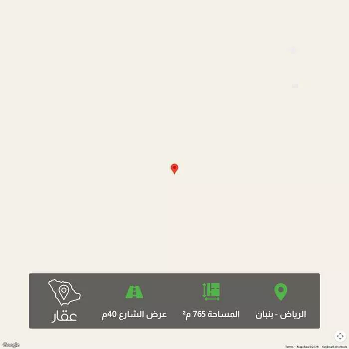 765 م² أرض في بنبان، الرياض معروضة بسعر ١٬٥٥٠٬٠٠٠ ريال، أعلى بنسبة 92% من متوسط سعر الحي البالغ ٨٠٨٬٥٠٠ ريال. بناءً على 949 عقار مشابه.