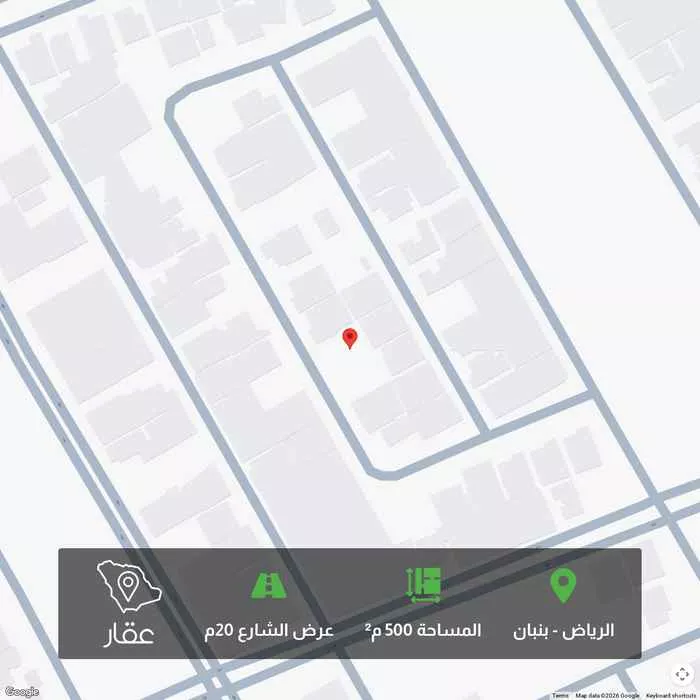 500 م² أرض في بنبان، الرياض معروضة بسعر ٢٬٣٠٠٬٠٠٠ ريال، أعلى بنسبة 186% من متوسط سعر الحي البالغ ٨٠٤٬٥٦٢٫٥ ريال. بناءً على 944 عقار مشابه.