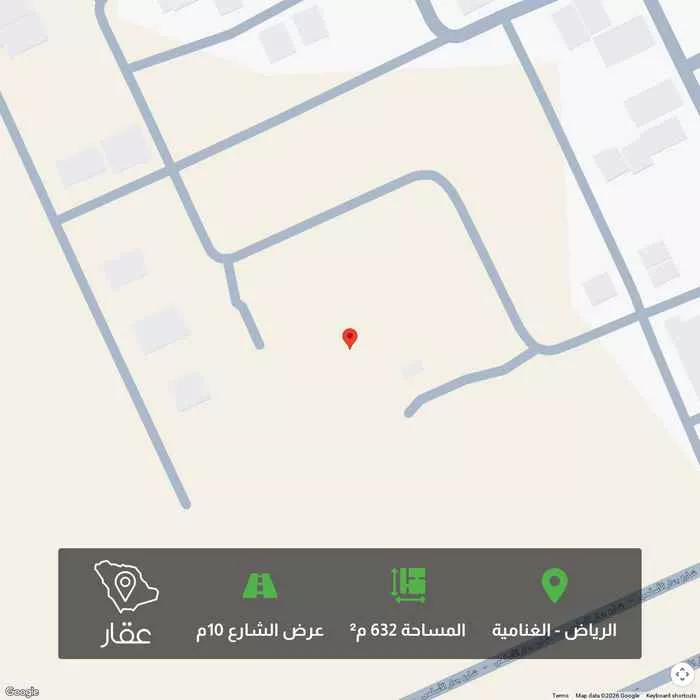 632 م² أرض في الغنامية، الرياض معروضة بسعر ٦٣٢٬٥٠٠ ريال، أعلى بنسبة 28% من متوسط سعر الحي البالغ ٤٩٥٬٠٠٨ ريال. بناءً على 87 عقار مشابه.