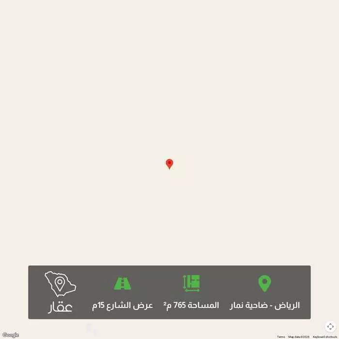 765 م² أرض في ضاحية نمار، الرياض معروضة بسعر ٥٨٠٬٦٣٥ ريال، أقل بنسبة 23% من متوسط سعر الحي البالغ ٧٥٠٬٠٠٠ ريال. بناءً على 439 عقار مشابه.