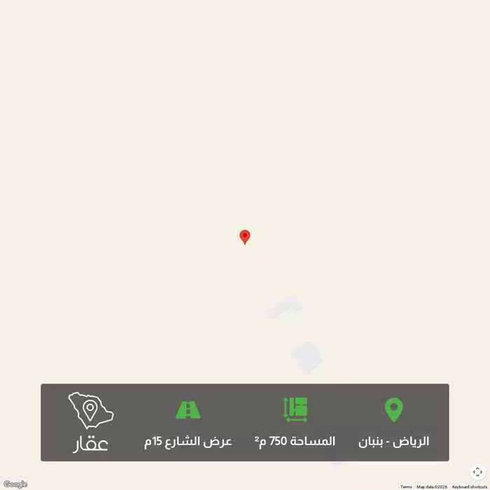 750 م² أرض في بنبان، الرياض معروضة بسعر ١٬٥٠٠٬٠٠٠ ريال، أعلى بنسبة 86% من متوسط سعر الحي البالغ ٨٠٤٬٥٦٢٫٥ ريال. بناءً على 944 عقار مشابه.