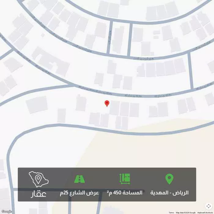 450 م² أرض في المهدية، الرياض معروضة بسعر ١٬٨٠٠٬٠٠٠ ريال، أقل بنسبة 2% من متوسط سعر الحي البالغ ١٬٨٣٩٬٨٤٠ ريال. بناءً على 364 عقار مشابه.