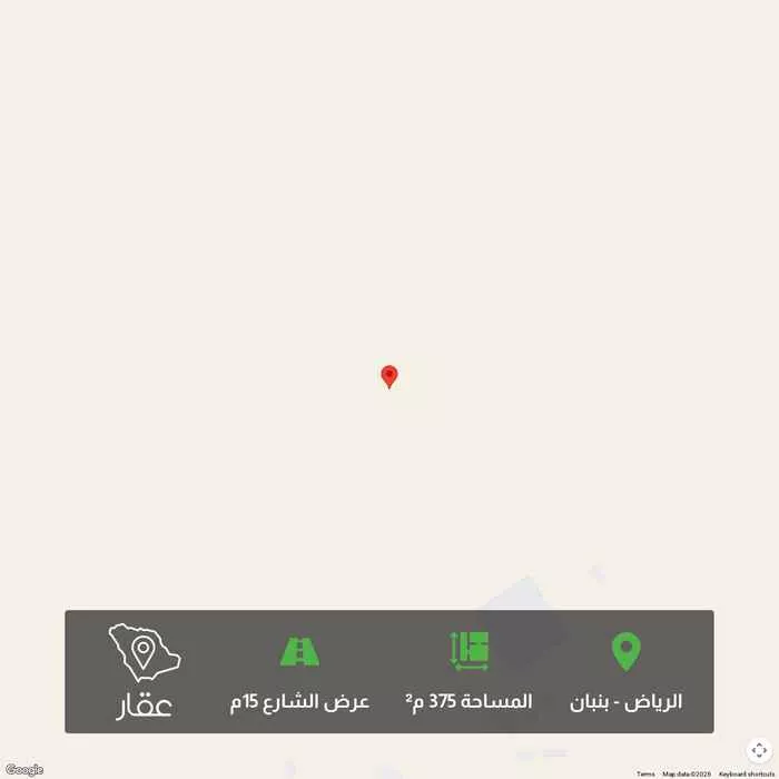 375 م² أرض في بنبان، الرياض معروضة بسعر ٤٤٢٬٥٠٠ ريال، أقل بنسبة 45% من متوسط سعر الحي البالغ ٨٠٤٬٥٦٢٫٥ ريال. بناءً على 944 عقار مشابه.