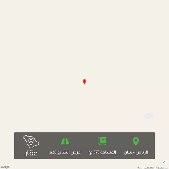 375 م² أرض في بنبان، الرياض معروضة بسعر ٧٥٠٬٠٠٠ ريال، أقل بنسبة 7% من متوسط سعر الحي البالغ ٨٠٤٬٥٦٢٫٥ ريال. بناءً على 944 عقار مشابه.