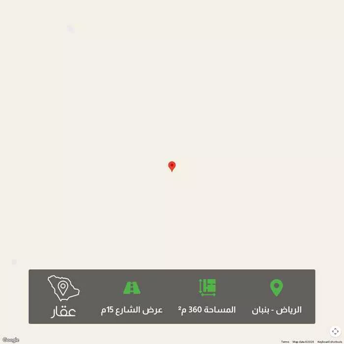 360 م² أرض في بنبان، الرياض معروضة بسعر ٥٩٠٬٠٠٠ ريال، أقل بنسبة 27% من متوسط سعر الحي البالغ ٨٠٨٬٥٠٠ ريال. بناءً على 947 عقار مشابه.