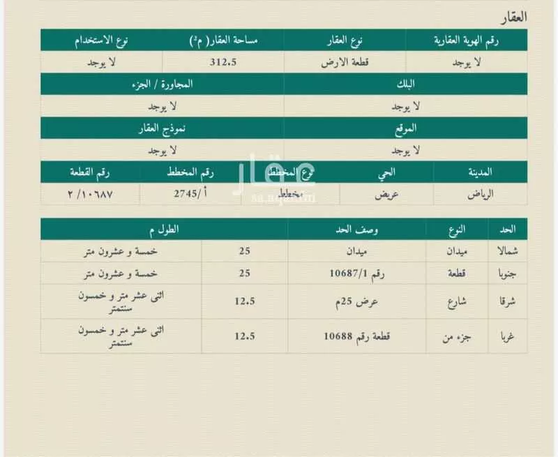 عرض على Aqarللبيع قطعة ارض في حي عريض المخطط 2745 / أ الذهبي القطعه 10687 المساحه 312.5 م الشارع 25 شرقي مزفلت + ميدان شمالي الاطوال 12.5 م في عمق 25 م سليمه من غرف الكهرب الشارع مزفلت قريبه من طريق النفود والدائ...