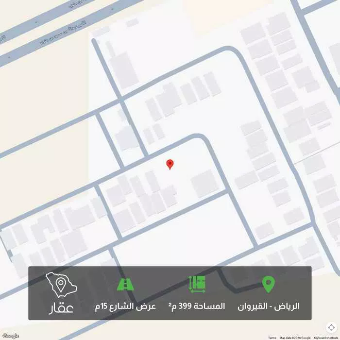 399 م² أرض في القيروان، الرياض معروضة بسعر ٢٬٩١٩٬٢٧٠ ريال، أقل بنسبة 14% من متوسط سعر الحي البالغ ٣٬٣٧٥٬٠٠٠ ريال. بناءً على 212 عقار مشابه.