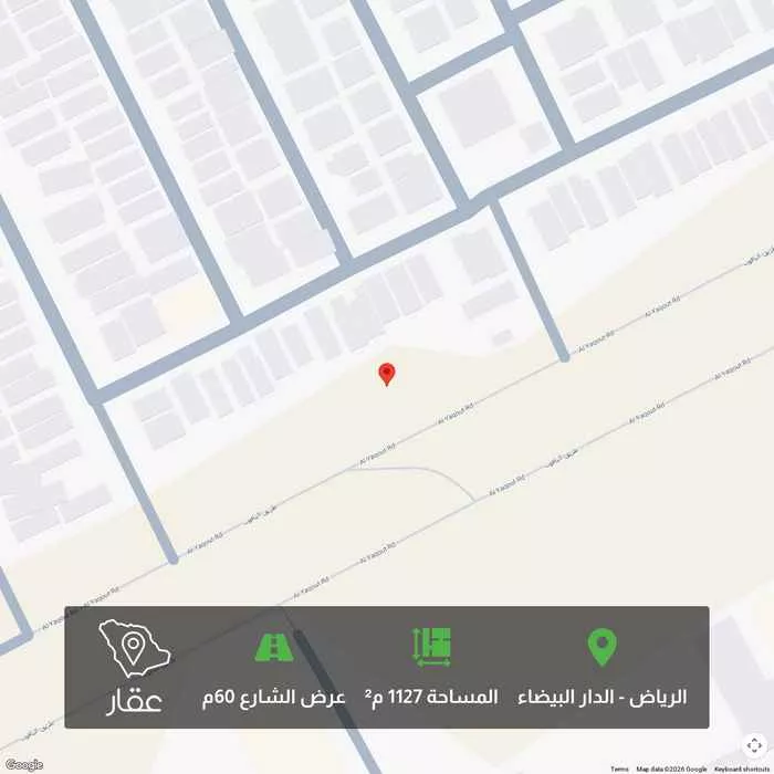 1127 م² أرض في الدار البيضاء، الرياض معروضة بسعر ٢٬٩٣١٬٥٠٠ ريال، أعلى بنسبة 111% من متوسط سعر الحي البالغ ١٬٣٨٧٬٥٠٠ ريال. بناءً على 40 عقار مشابه.