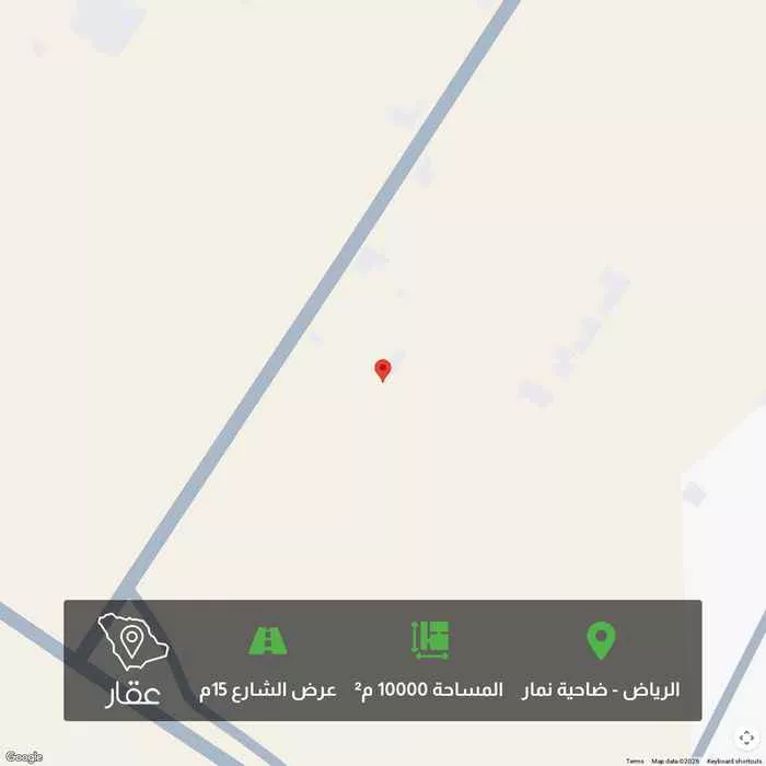 10000 م² أرض في ضاحية نمار، الرياض معروضة بسعر ٥٬٠٠٠٬٠٠٠ ريال، أعلى بنسبة 561% من متوسط سعر الحي البالغ ٧٥٦٬٦٠٠ ريال. بناءً على 438 عقار مشابه.