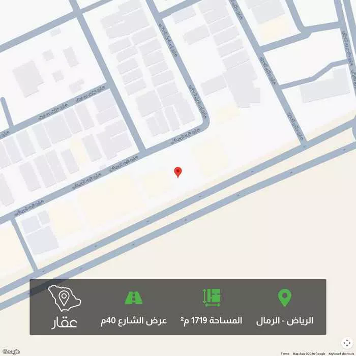 1719 م² أرض في الرمال، الرياض معروضة بسعر ٨٬٦٠٠٬٠٠٠ ريال، أعلى بنسبة 258% من متوسط سعر الحي البالغ ٢٬٤٠٠٬٠٠٠ ريال. بناءً على 273 عقار مشابه.