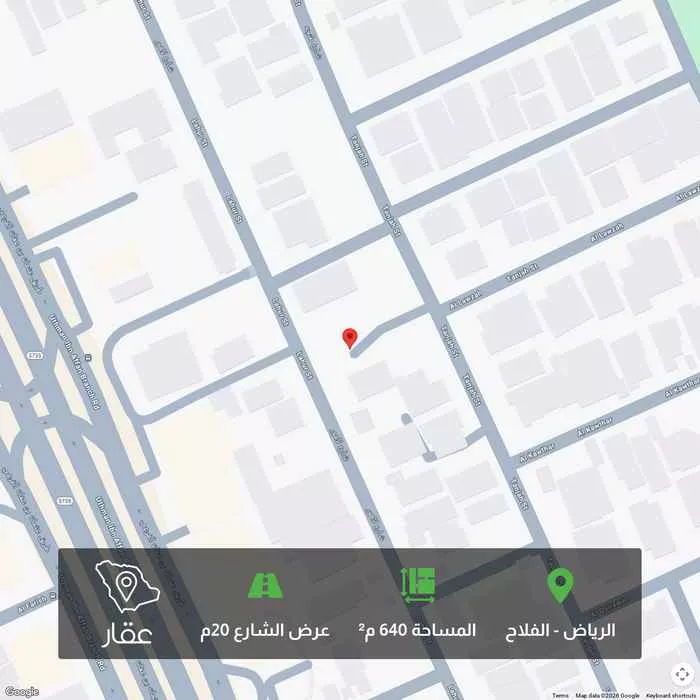 أرض سكنية بمساحة 640 متر بحي الفلاح تفتح غربا على شارع عرضه 20متر شرقا .ساحة مفتوحه شمالا قطعة جنوبا قطعة