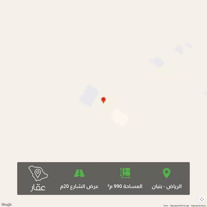 990 م² أرض في بنبان، الرياض معروضة بسعر ٣٬١٠٠٬٠١٠ ريال، أعلى بنسبة 283% من متوسط سعر الحي البالغ ٨٠٨٬٥٠٠ ريال. بناءً على 949 عقار مشابه.
