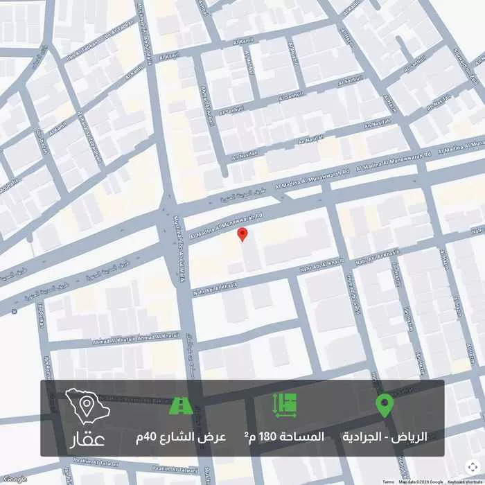 عرض على Aqarطريق المدينة المنورة النازل باتجاه طريق عسير ومحطة المترو ( محطة مترو الجرادية ) نظام البناء صامت بدون ارتداد تجاري سكني الادوار السكنية المسموحه ثلاث ادوار قابلة للزياده جميع الخدمات واصله ملاحظة / ط...