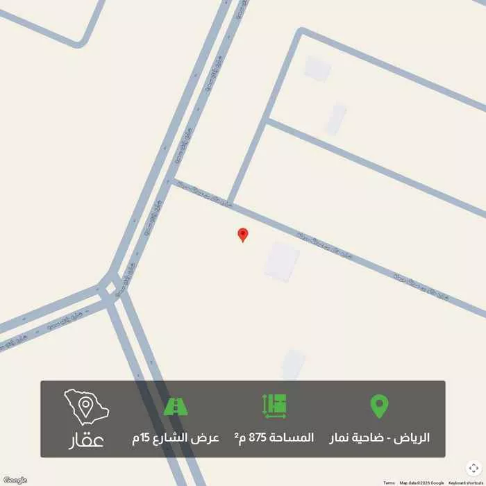 875 م² أرض في ضاحية نمار، الرياض معروضة بسعر ١٨٬٠٠٠ ريال، أقل بنسبة 98% من متوسط سعر الحي البالغ ٧٥٠٬٠٠٠ ريال. بناءً على 439 عقار مشابه.