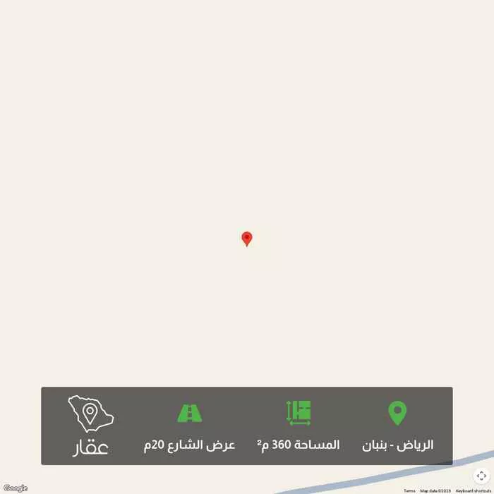 360 م² أرض في بنبان، الرياض معروضة بسعر ٢٣٬٤٠٠ ريال، أقل بنسبة 97% من متوسط سعر الحي البالغ ٨٠٤٬٥٦٢٫٥ ريال. بناءً على 944 عقار مشابه.