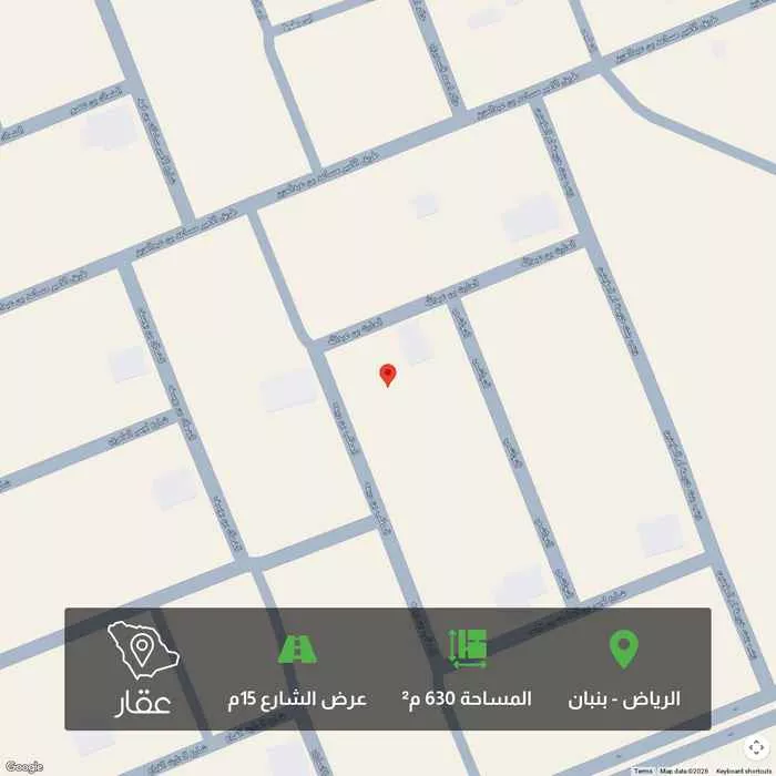 630 م² أرض في بنبان، الرياض معروضة بسعر ٢٩٬٤٠٠ ريال، أقل بنسبة 96% من متوسط سعر الحي البالغ ٨٠٤٬٥٦٢٫٥ ريال. بناءً على 944 عقار مشابه.
