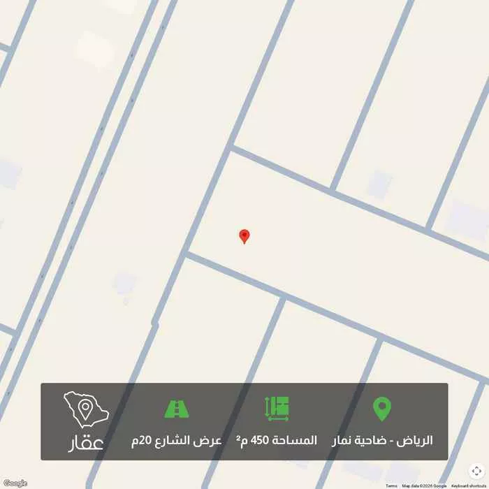 450 م² أرض في ضاحية نمار، الرياض معروضة بسعر ٢٤٬٠٠٠ ريال، أقل بنسبة 97% من متوسط سعر الحي البالغ ٧٥٠٬٠٠٠ ريال. بناءً على 439 عقار مشابه.