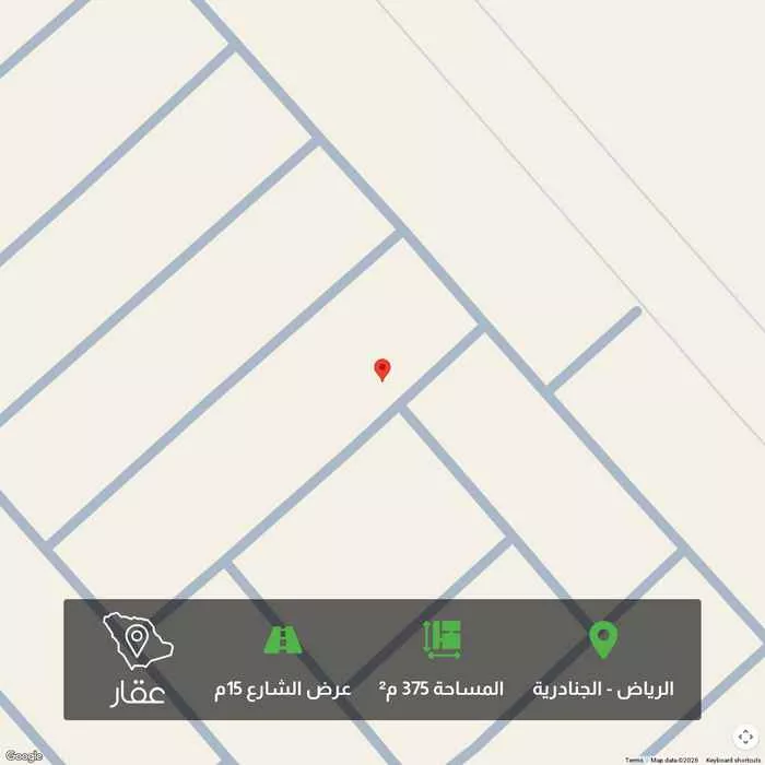 375 م² أرض في الجنادرية، الرياض معروضة بسعر ٣٦٬٠٠٠ ريال، أقل بنسبة 95% من متوسط سعر الحي البالغ ٧٧٧٬٠٠٠ ريال. بناءً على 132 عقار مشابه.