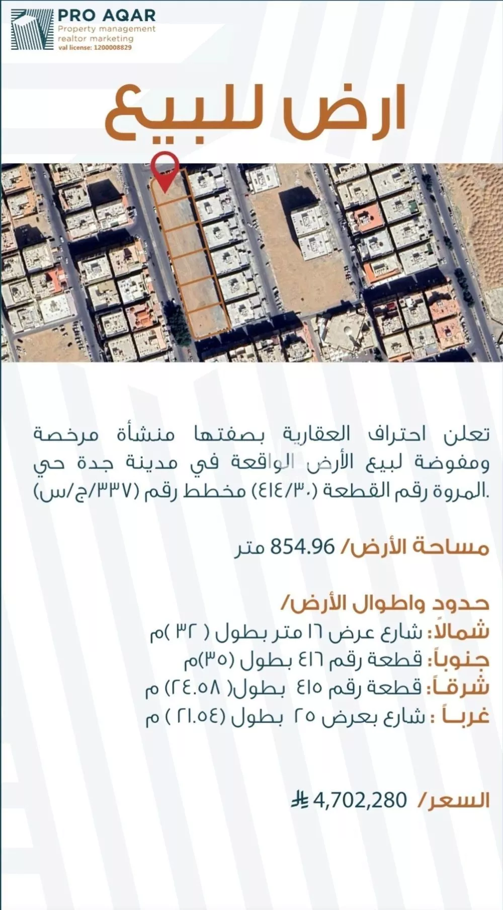 عرض على Aqarتعلن احتراف العقارية بصفتها منشأة مرخصة ومفوضة لبيع الأرض الواقعة في مدينة جدة حي المروة رقم القطعة(30/ 414) مخطط رقم (337/ج/س). 1 - مساحة الأرض/854.96 م 2 - حدود واطوال الارض: ⬆شمالاً: شارع عرض 16 مت...