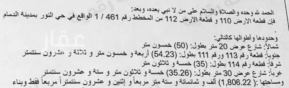 1806 م² أرض في النور، المنطقة الشرقية معروضة بسعر ٢٬٨٧١٬٨٩٠ ريال، أعلى بنسبة 140% من متوسط سعر الحي البالغ ١٬١٩٧٬٠٠٠ ريال. بناءً على 25 عقار مشابه.