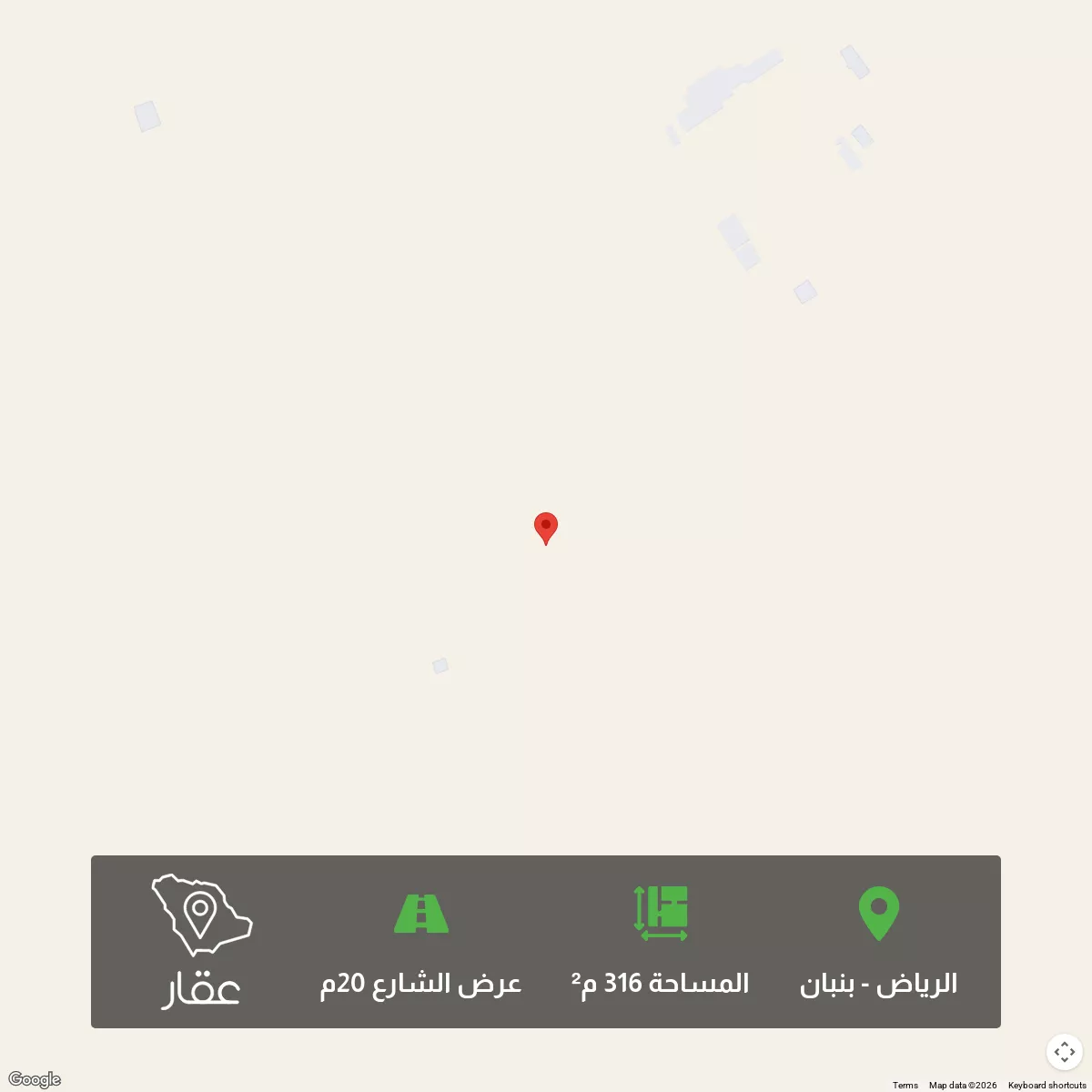 316 م² أرض في بنبان، الرياض معروضة بسعر ٥٤٩٬٨٤٠ ريال، أقل بنسبة 32% من متوسط سعر الحي البالغ ٨٠٤٬٥٦٢٫٥ ريال. بناءً على 944 عقار مشابه.