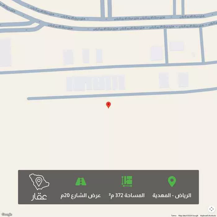 372 م² أرض في المهدية، الرياض معروضة بسعر ١٬٤٠٠٬٥٨٠ ريال، أقل بنسبة 24% من متوسط سعر الحي البالغ ١٬٨٣٩٬٨٤٠ ريال. بناءً على 364 عقار مشابه.