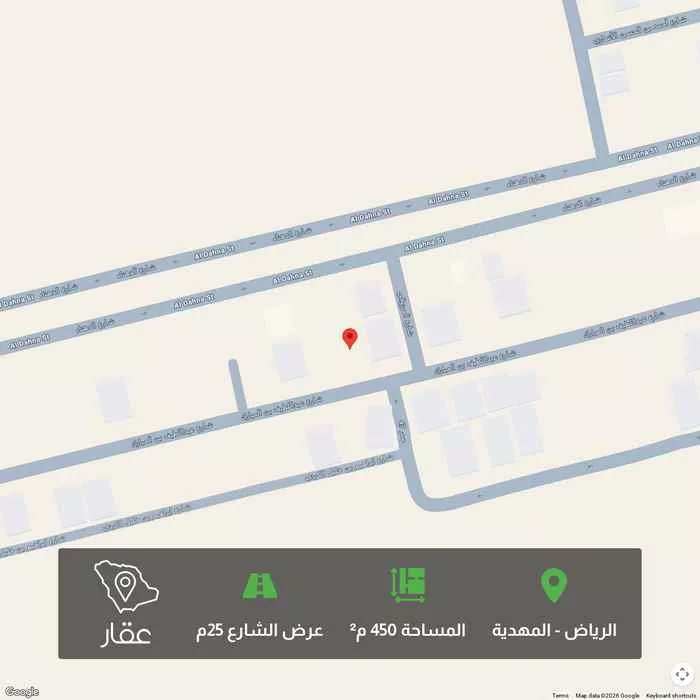 450 م² أرض في المهدية، الرياض معروضة بسعر ٢٬٠٥٠٬٢٠٠ ريال، أعلى بنسبة 11% من متوسط سعر الحي البالغ ١٬٨٣٩٬٨٤٠ ريال. بناءً على 364 عقار مشابه.
