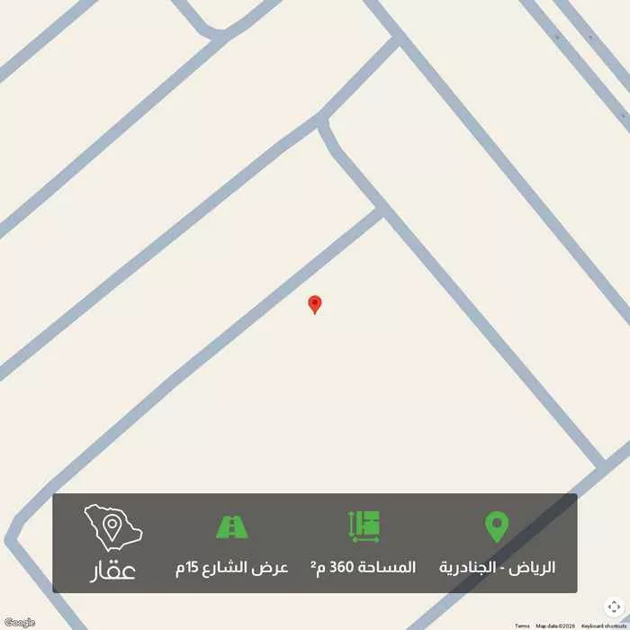360 م² أرض في الجنادرية، الرياض معروضة بسعر ٩٣٦٬٠٠٠ ريال، أعلى بنسبة 20% من متوسط سعر الحي البالغ ٧٧٧٬٠٠٠ ريال. بناءً على 132 عقار مشابه.