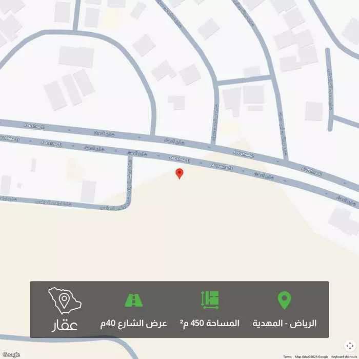 عرض على Aqarللبيع ارض تجارية حي المهديه المساحه ٤٥٠م الواجهه ٤٠ شمالي السعر ٦٦٥٠