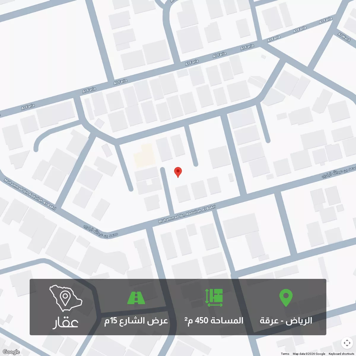 450 م² أرض في عرقة، الرياض معروضة بسعر ٣٬٠١٥٬٠٠٠ ريال، أقل بنسبة 28% من متوسط سعر الحي البالغ ٤٬١٨٠٬٤٨٠ ريال. بناءً على 60 عقار مشابه.