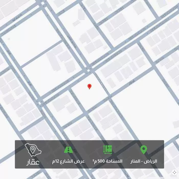 500 م² أرض في المنار، الرياض معروضة بسعر ٢٬٧٠٠٬٠٠٠ ريال، أقل بنسبة 18% من متوسط سعر الحي البالغ ٣٬٣٠٠٬٠٠٠ ريال. بناءً على 33 عقار مشابه.