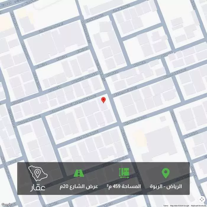 459 م² أرض في الربوة، الرياض معروضة بسعر ٢٬٩٨٣٬٥٠٠ ريال، أعلى بنسبة 13% من متوسط سعر الحي البالغ ٢٬٦٤٠٬٠٠٠ ريال. بناءً على 30 عقار مشابه.