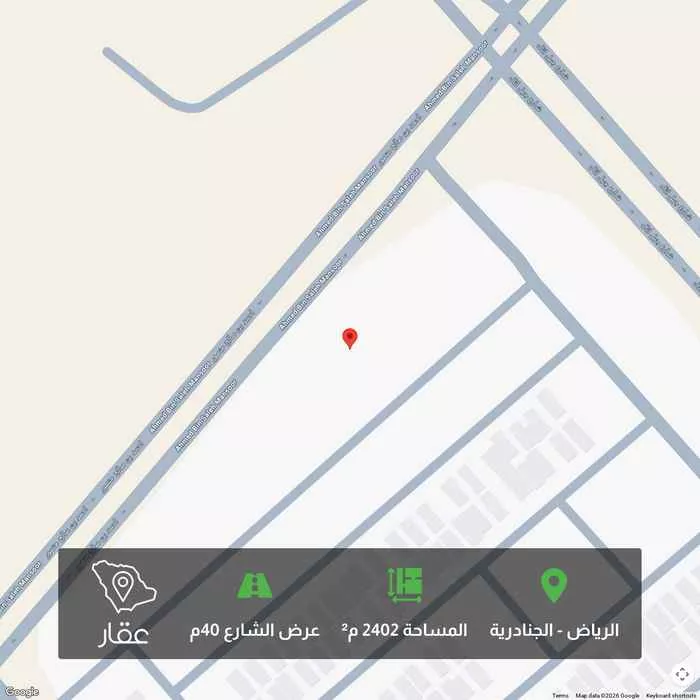 2402 م² أرض في الجنادرية، الرياض معروضة بسعر ٤٬٨٠٥٬٤٦٠ ريال، أعلى بنسبة 518% من متوسط سعر الحي البالغ ٧٧٧٬٠٠٠ ريال. بناءً على 132 عقار مشابه.