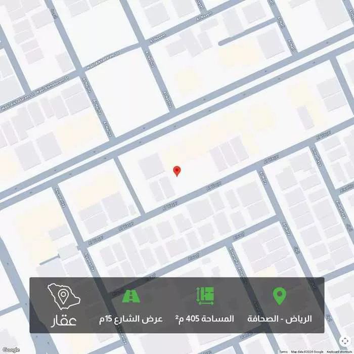 405 م² أرض في الصحافة، الرياض معروضة بسعر ٢٬٨٣٥٬٠٠٠ ريال، أقل بنسبة 50% من متوسط سعر الحي البالغ ٥٬٦٢٨٬٠٠٠ ريال. بناءً على 55 عقار مشابه.