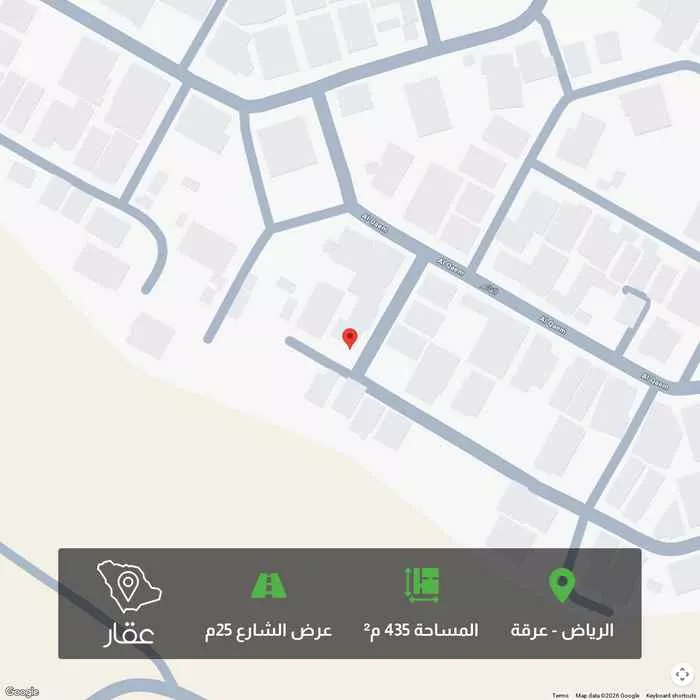 عرض على Aqarرؤيتك الأولى للعقارات تقدم لكم: أرض للبيع حي : عرقة • المساحة: 435.62 متر مربع • الأطوال: 12.5 م × 35 م الموقع: • على شارعين: • شرقي بعرض 4 أمتار يفتح على ميدان واسع • جنوبي بعرض 12 مترًا يفتح على ميد...