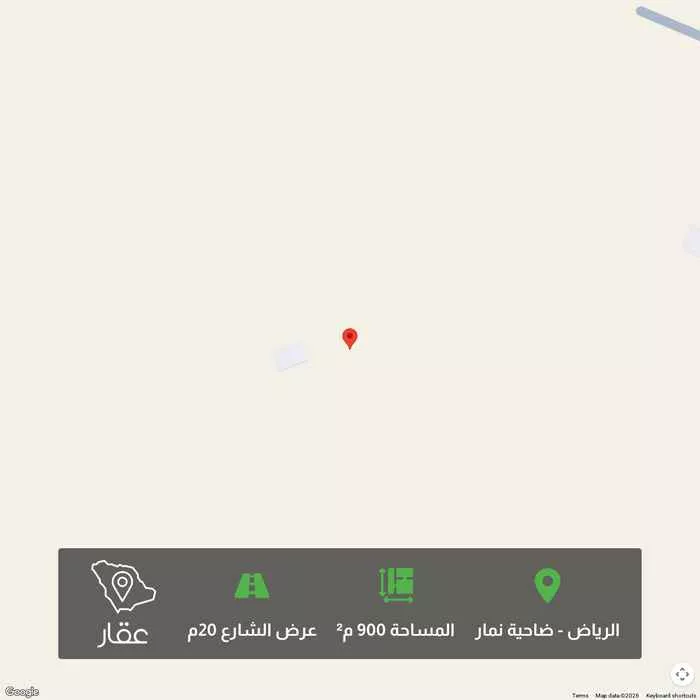 900 م² أرض في ضاحية نمار، الرياض معروضة بسعر ٢٬٥٢٠٬٠٠٠ ريال، أعلى بنسبة 236% من متوسط سعر الحي البالغ ٧٥٠٬٠٠٠ ريال. بناءً على 439 عقار مشابه.