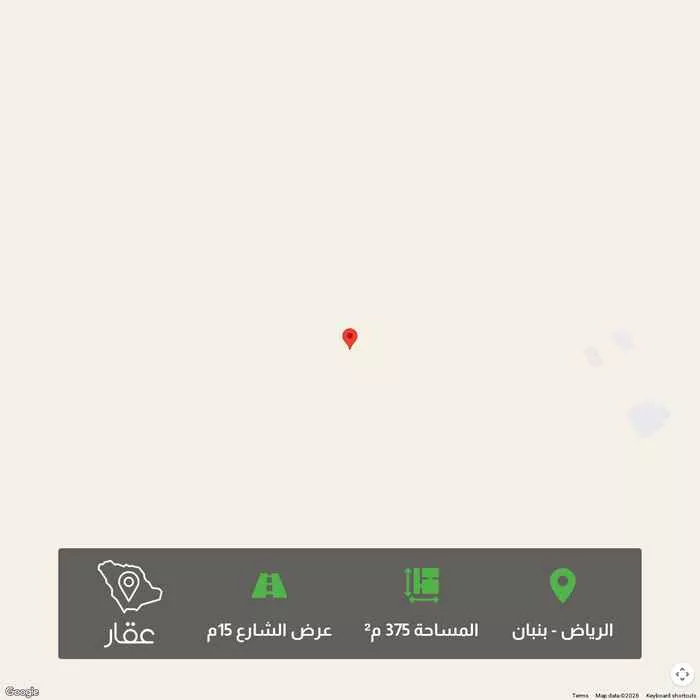 375 م² أرض في بنبان، الرياض معروضة بسعر ٧٥٠٬٠٠٠ ريال، أقل بنسبة 7% من متوسط سعر الحي البالغ ٨٠٨٬٥٠٠ ريال. بناءً على 949 عقار مشابه.