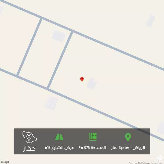 عرض على Aqarأرض سكنية للبيع بضاحية نمار - الرياض رقم القطعة: ١٠١٣٨ رقم المخطط: ٣٠٢٠ المساحة: 375 متر مربع الواجهة: شمالية على شارع 15 متر بطول 12.5 متر على الشارع الغرض: تجاري + سكني موقع مميز واجهة شمالية مناسب ...