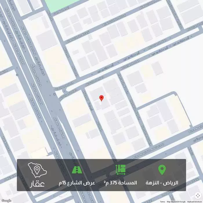 375 م² أرض في النزهة، الرياض معروضة بسعر ٣٬٠٠٠٬٠٠٠ ريال، أقل بنسبة 43% من متوسط سعر الحي البالغ ٥٬٢٥٠٬٠٠٠ ريال. بناءً على 18 عقار مشابه.