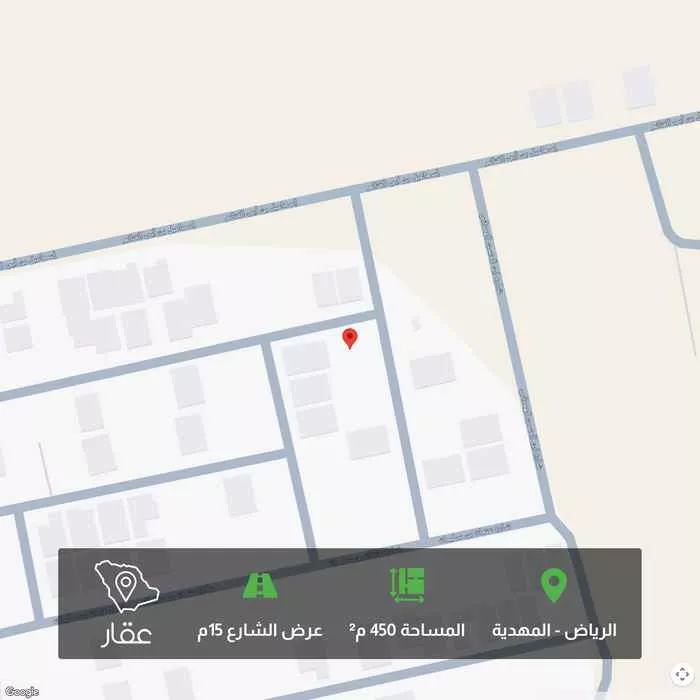 عرض على Aqar� للبيع — أرض سكنية مناسبة للمطورين وقابلة للتجزئة الحي: المهدية – الرياض المساحة: 450 متر مربع الأطوال والواجهات: • شارع شمالي 15 م • شارع شرقي 15 م السعر المطلوب: 1,600,000 ريال الموقع على الخريطة: ...